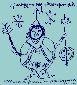 It shows only outline, eyes and mouth. To the left is a warrior in the