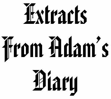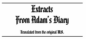 [NOTE. — I translated a portion of this diary some years ago, and a friend of mine printed a few copies in an incomplete form, but the public never got them. Since then I have deciphered some more of Adam's hieroglyphics, and think he has now become sufficiently important as a public character to justify this publication. —M. T.] |