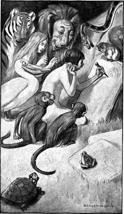 | Tuesday She has taken up with a snake now. The other animals are glad, for she was always experimenting with them and bothering them; and I am glad, because the snake talks, and this enables me to get a rest. |