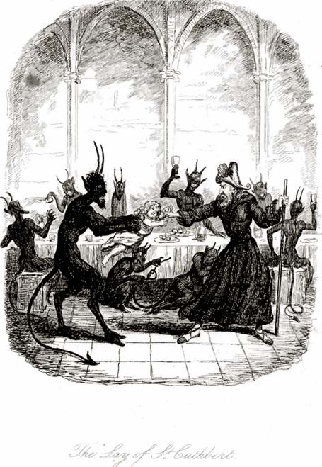 | And his Imps—run! run! run!—they're all fiends in disguise, Who've partly assumed, with more sombre complexions, The forms of Sir Guy Le Scroope's friends and connexions, And He—at the top there—that grim-looking elf— Run! run!—that's the "muckle-horned Clootie" himself! | ||