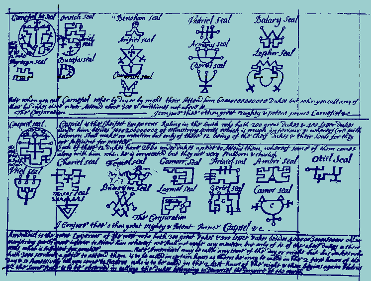 These include example manuscript material from British Museum copies of the Lesser Key of Solomon. Both Thelema Lodge and Ankh af na Khonsu Lodge are offering classes in May that relate to this source. In addition, microfilms of the manuscripts of the Greater and Lesser Keys of Solomon and of the Enochian notes in John Dee and Edward Kelly's hand are available for study at San Anselmo. The figure in the Chariot is from a medieval MS depicting Emperor Otto of the Franks.