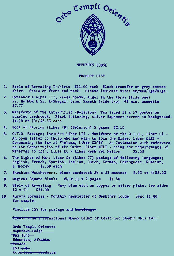 Do not attempt to order these products now. Nepthys Lodge of OTO closed some years ago.