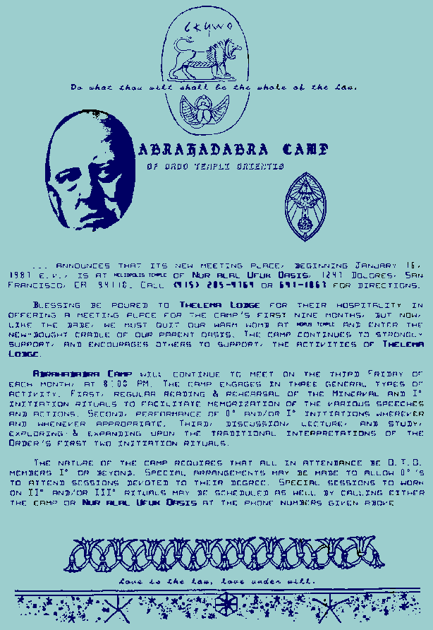 Note to update: the addresses and phone numbers in these issues of the Thelema Lodge Calendars are obsolete since the closing of the Lodge. They are here for historic purposes only and should not be visited or called.