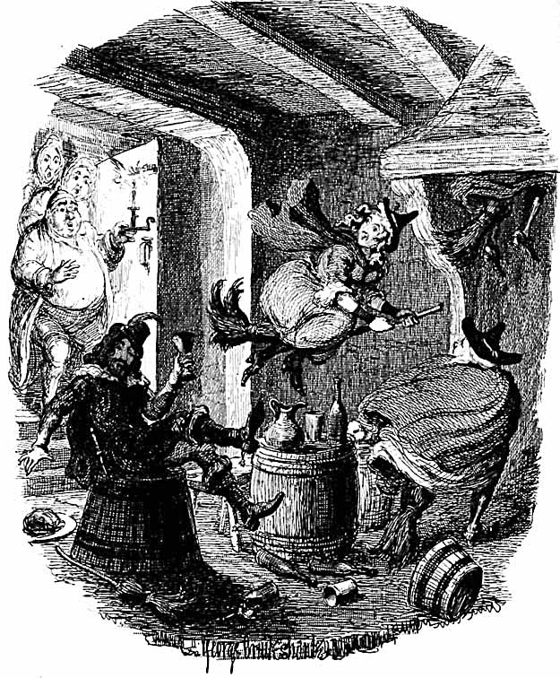 The end poked in his chest with a force makes him gasp, And, despite the decorum so due to the Quorum, His worship's upset, and so too is his jorum; And Madge is astride on the broomstick before 'em. "Hocus Pocus! Quick, Presto! and Hey Cockalorum! Mount, mount for your life, Rob!--Sir Justice, adieu!-- --Hey up the chimney-pot! hey after you!" | ||